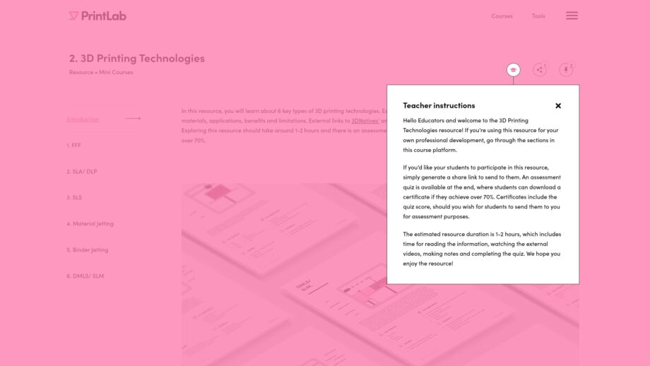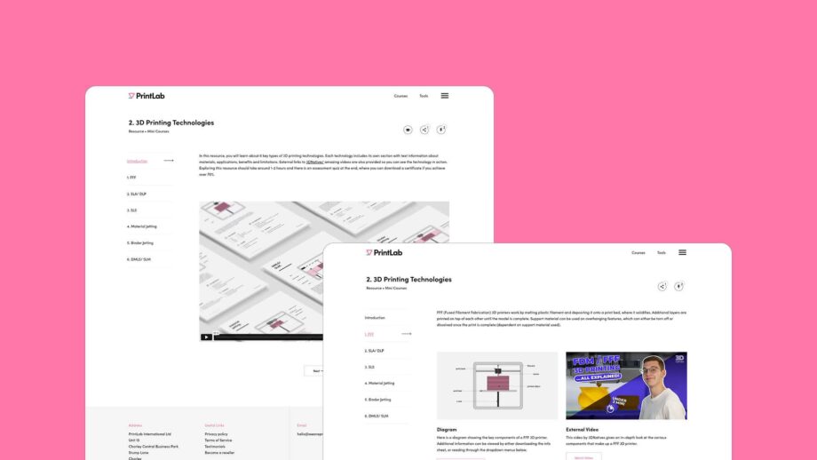 The course learning platform takes you through a range of informative content and documentation to teach you about key 3D printing technologies.